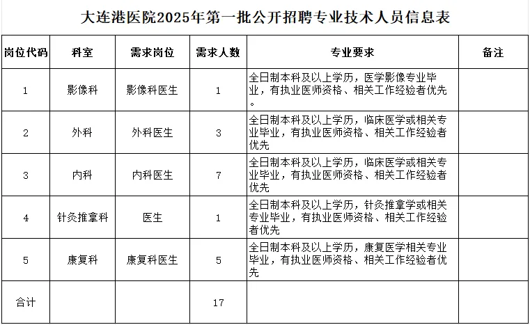 5、岗位所需要的其他条件,详见《大连港医院2025年第一批公开招聘专业技术人员信息表》(附件1)。