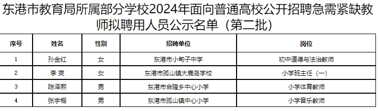 关于东港市教育局所属部分学校2024年面向普通高校公开招聘急需紧缺教师拟聘用人员(第二批)的公告