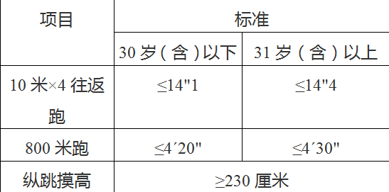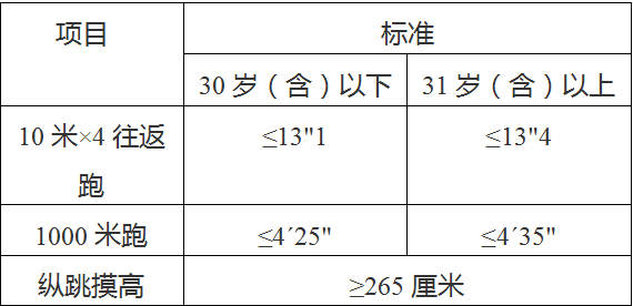 2.体能测试内容:体能测试标准参照《公安机关录用人民警察体能测评项目和标准》的通知文件执行。