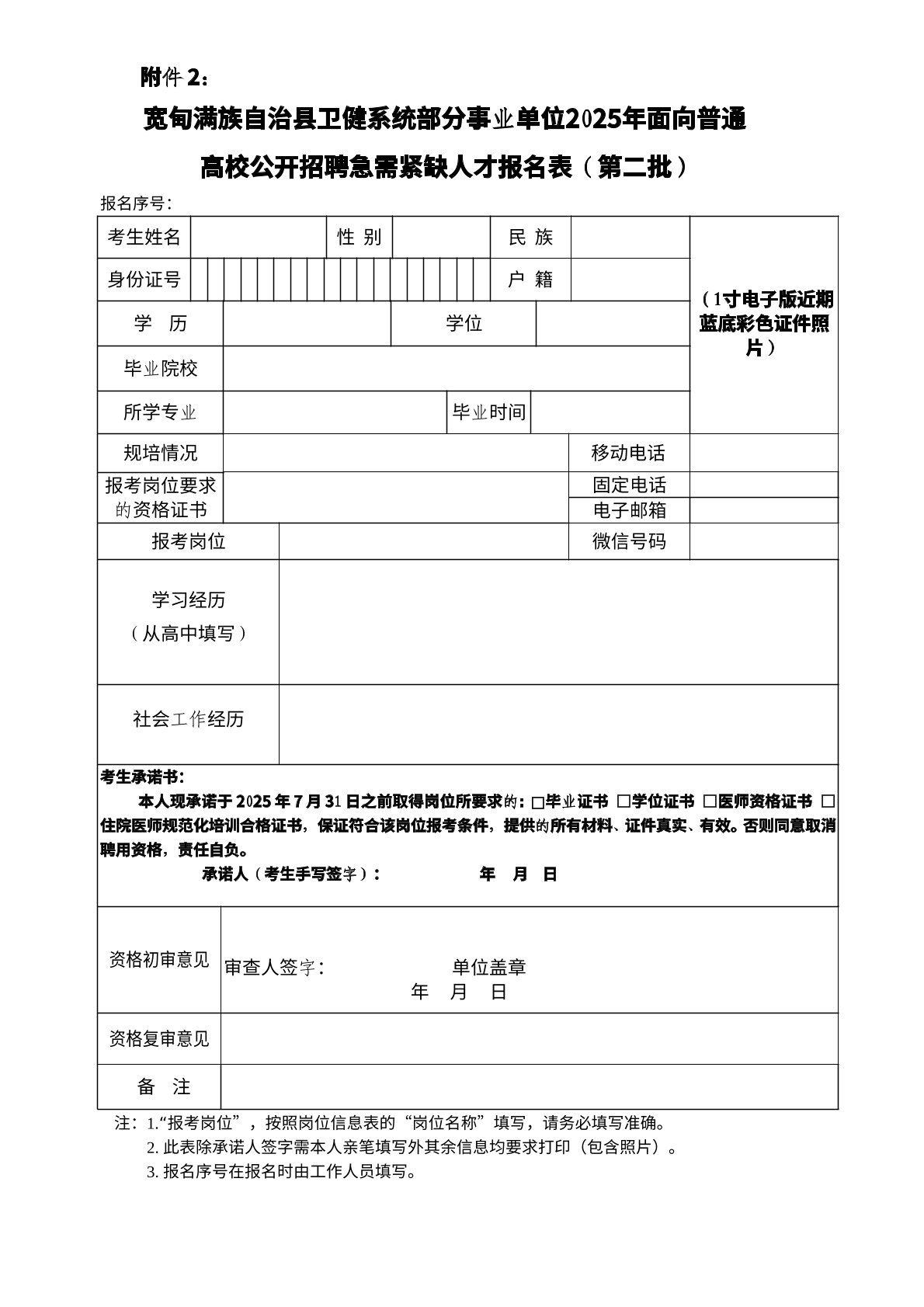 1.本人手写签名《宽甸满族自治县卫健系统部分事业单位2025年面向普通高校公开招聘急需紧缺人才报名表》(第二批)(附件2)。