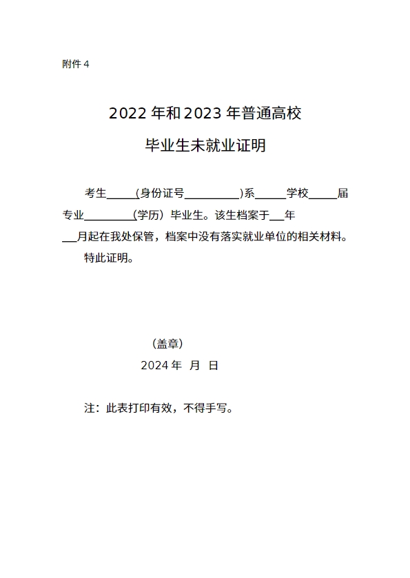 9.2024年应届毕业生须提供加盖院系公章的《普通高校2024年应届毕业生证明》(模板在附件3下载)。2022年、2023年离校未就业的普通高校毕业生,须提供未就业证明(模板在附件4下载)和社保部门出具的未缴费证明。其中,档案仍保留在毕业院校的,由毕业院校毕业生就业指导部门或省高校毕业生就业指导中心出具证明;档案已转到县(市、区)级及以上政府人事、教育部门所属人才服务机构或毕业生就业工作机构保管的,由相应的档案保管部门出具证明。