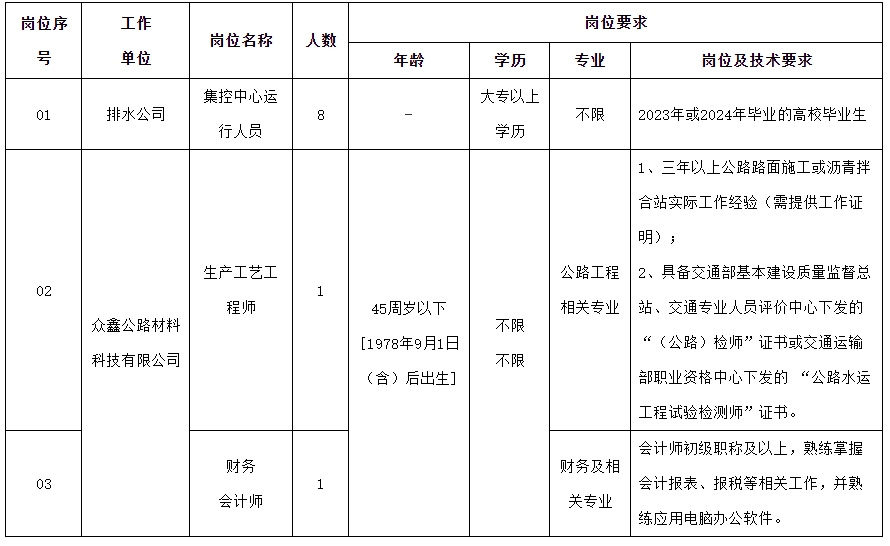 2、众鑫公路材料科技有限公司:生产工艺工程师1人、财务会计师1人。