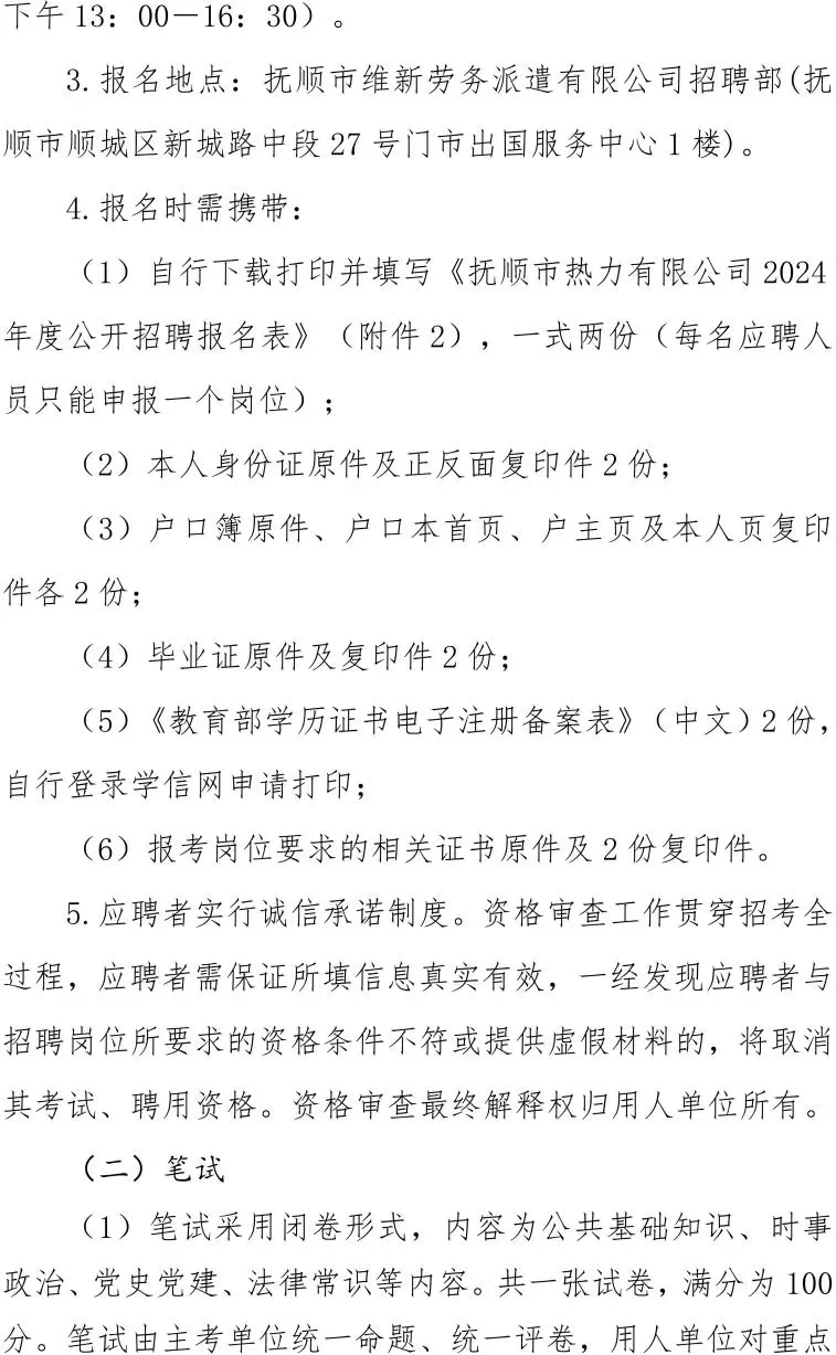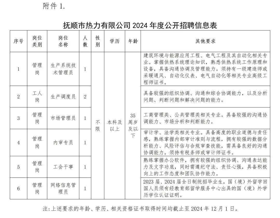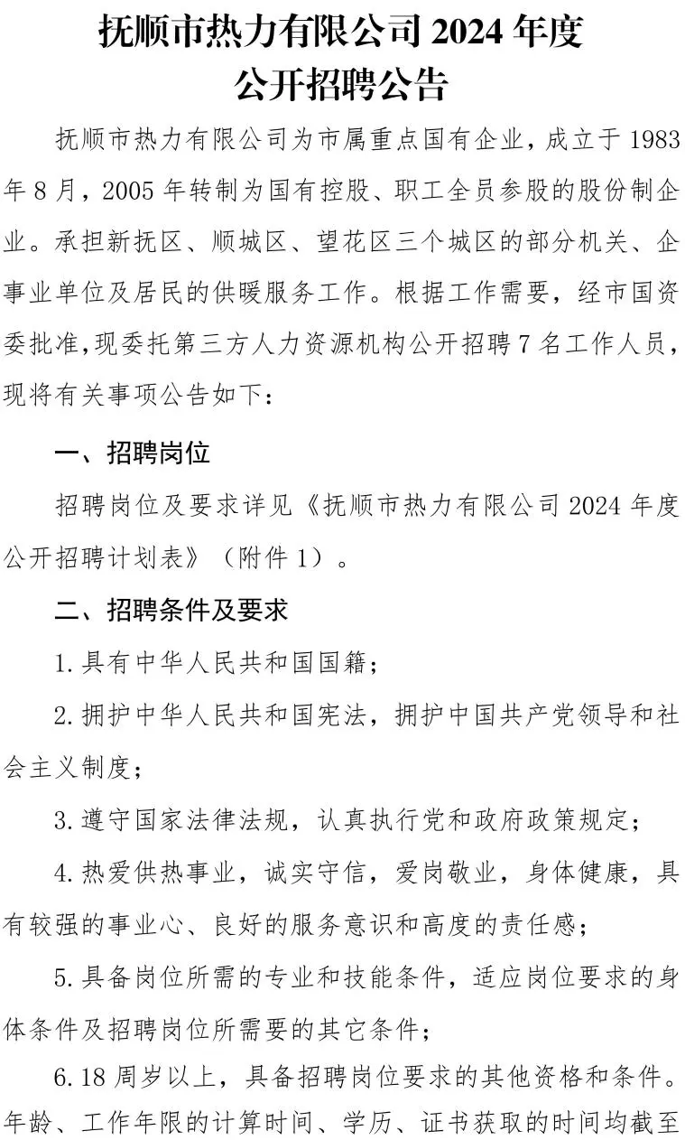 抚顺市热力有限公司2024年度公开招聘7人公告