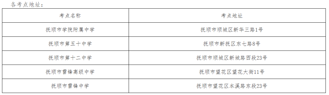 7.考点抚顺市雷锋高级中学(地址:抚顺市望花区望花大街11号)和考点抚顺市雷锋中学(又名抚顺市雷锋学校,地址:抚顺市望花区本溪路东段23号)名称相似,学校距离较近,请考生注意辨别区分,切勿走错考点。