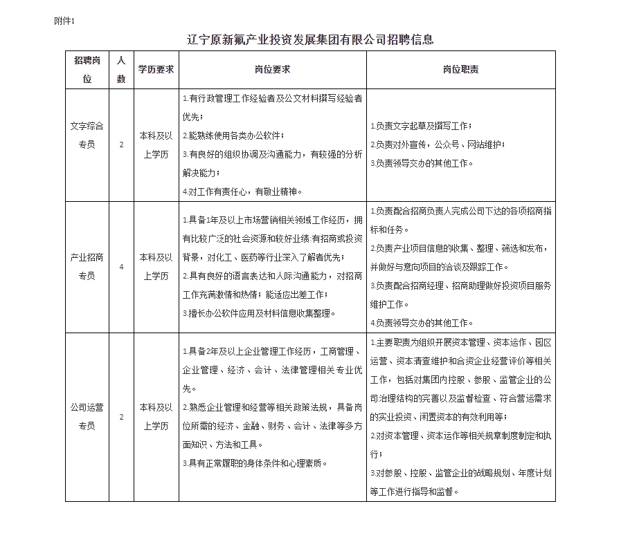 为落实市委、市政府、县委、县政府加快园区体制机制改革的总体要求,完善“管委会+公司”的运行机制,推进氟产业集群建设发展,经报阜新县国资办及辽宁阜新氟产业开发区管委会同意,向阜新县人社局备案,辽宁原新氟产业投资发展集团有限公司(为阜新县国资办下属国有独资企业)拟面向社会公开招聘工作人员,具体公告如下: