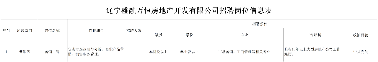 为满足业务发展需要,盛融万恒公司本次拟招聘营销主管1人,负责商业产品营销及销售业务管理。现公告如下: