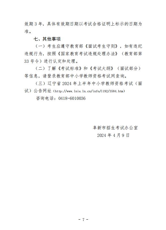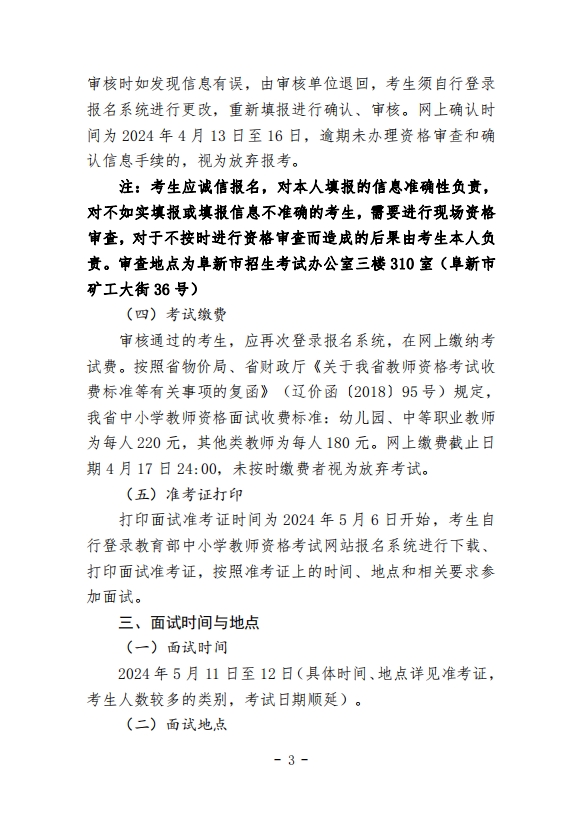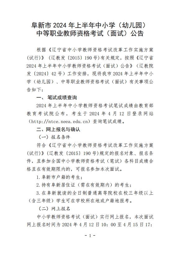 阜新市 2024 年上半年中小学(幼儿园) 中等职业教师资格考试(面试)公告