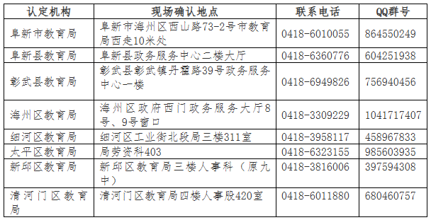 各认定机构现场确认地点及相关信息表: