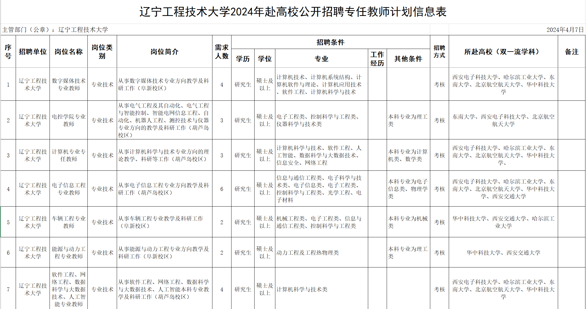 辽宁工程技术大学2024年赴高校公开招聘专任教师计划信息表