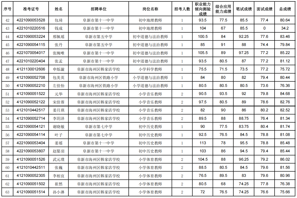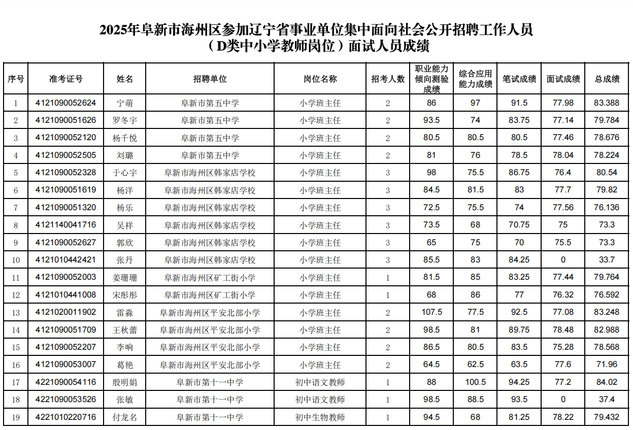 2025年阜新市海州区参加辽宁省事业单位集中面向社会公开招聘工作人员(D类中小学教师岗位)面试人员成绩