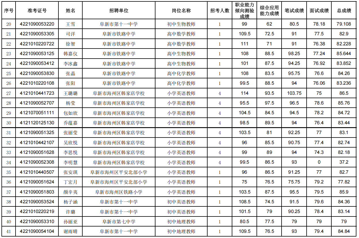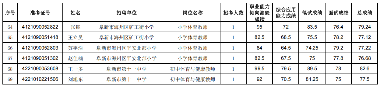 阜新市事业单位公开招聘2021年(含)以后从阜新市入伍、2024年退伍 (毕业)的普通高校大学生退役士兵面试人员总成绩