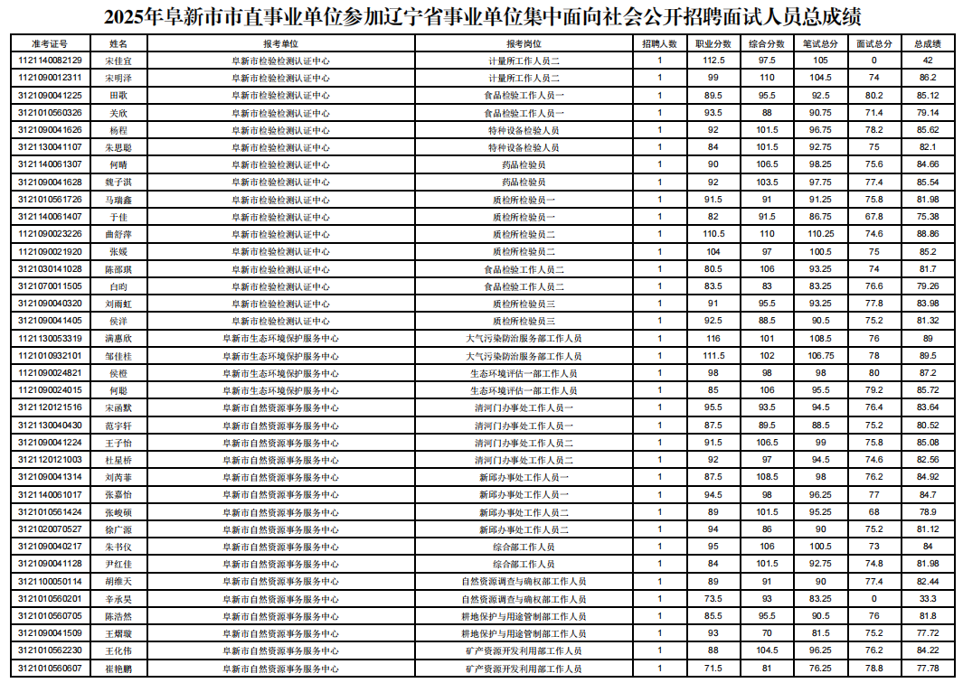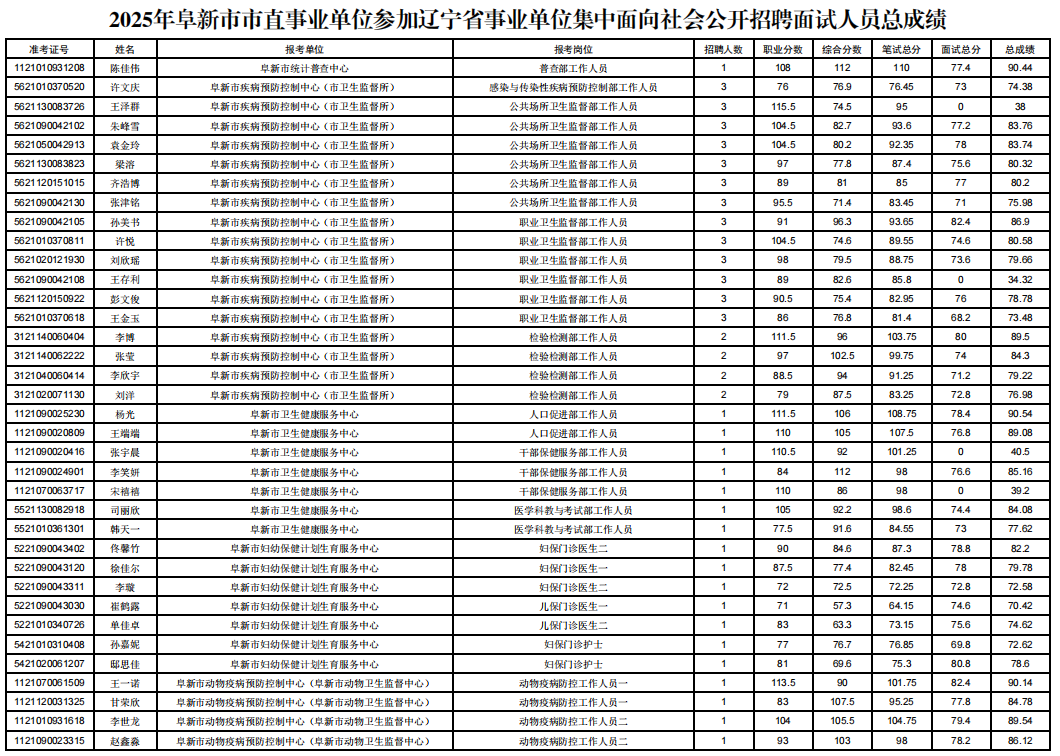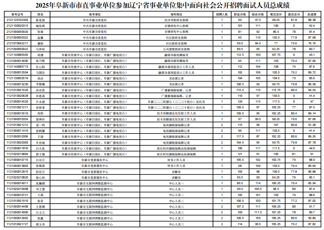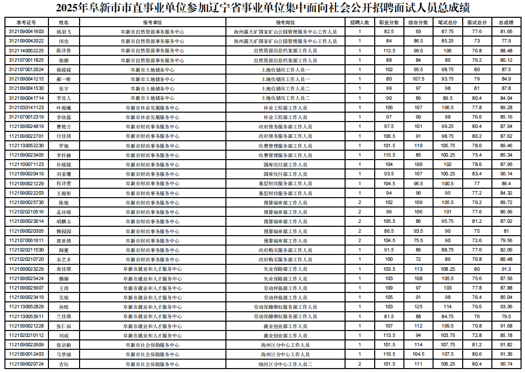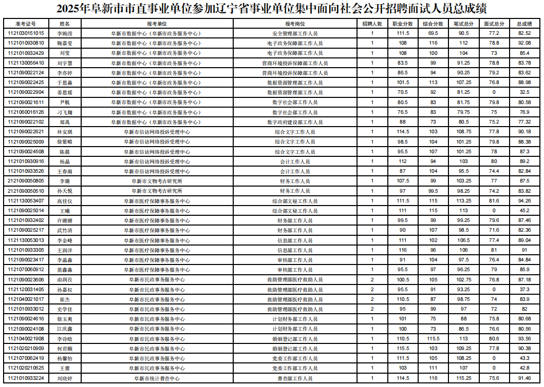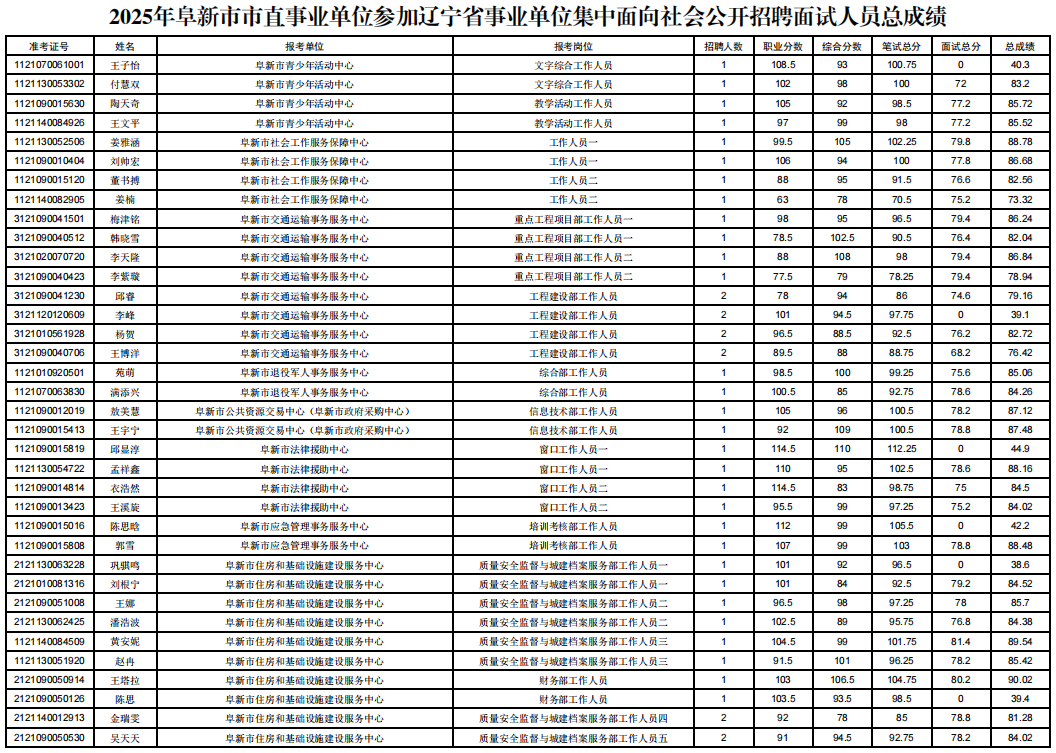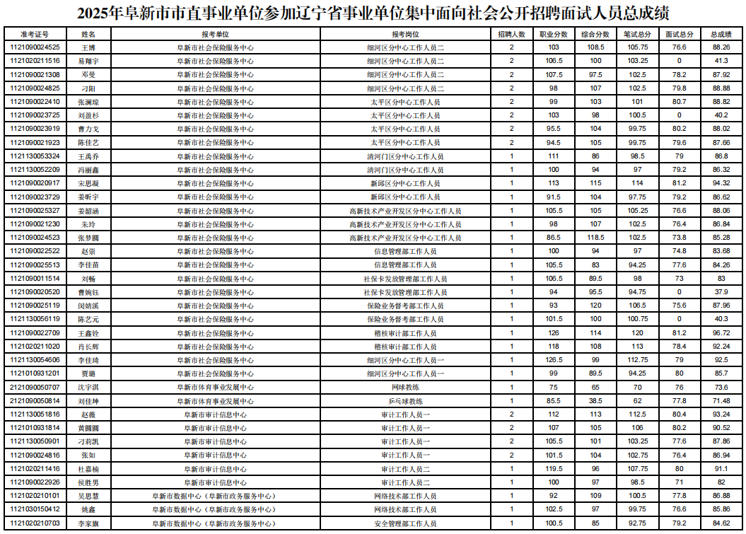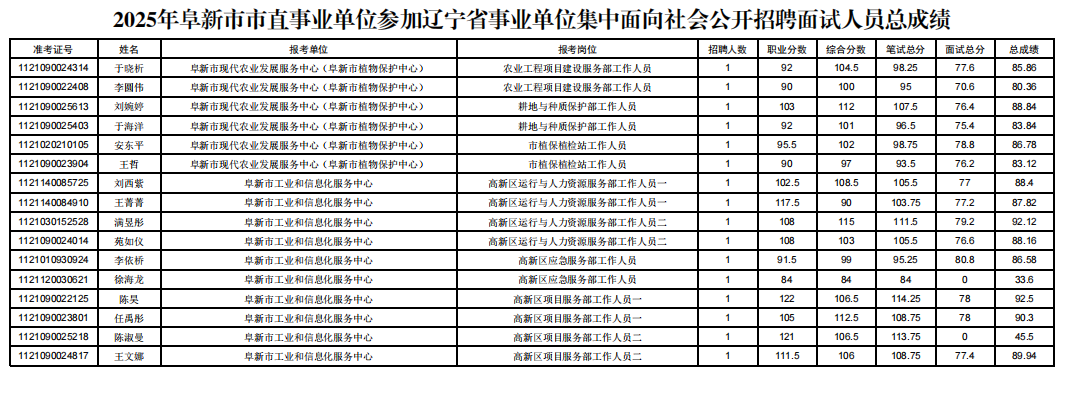 2025年阜新市市直事业单位参加辽宁省事业单位集中面向社会公开招聘面试人员总成绩