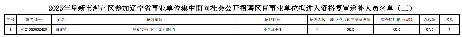 2025年阜新市海州区参加辽宁省事业单位集中面向社会 公开招聘区直事业单位拟进入资格复审递补人员名单(三)