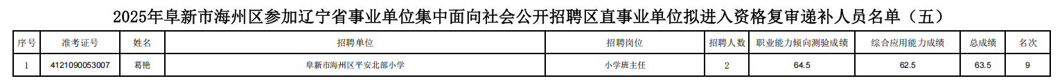 2025年阜新市海州区参加辽宁省事业单位集中面向社会公开招聘区直事业单位拟进入资格复审递补人员名单(五)