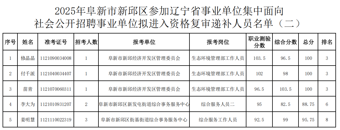 2025年阜新市新邱区参加辽宁省事业单位集中面向社会公开招聘 事业单位拟进入资格复审递补人员名单(二)