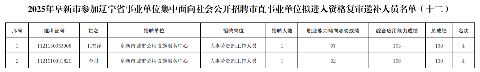 2025年阜新市参加辽宁省事业单位集中面向社会公开招聘市直事业单位 拟进入资格复审递补人员名单(十二)