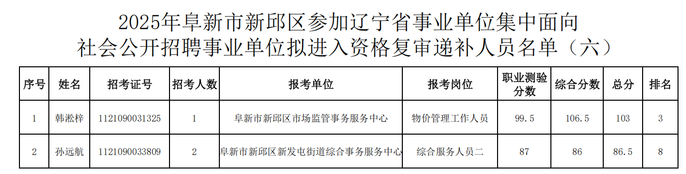2025年阜新市新邱区参加辽宁省事业单位集中面向社会公开招聘 事业单位拟进入资格复审递补人员名单(六)