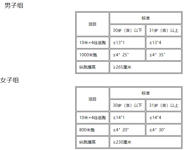 2.体能测试内容:体能测试标准参照《公安机关录用人民警察体能测评项目和标准》的通知文件执行。
