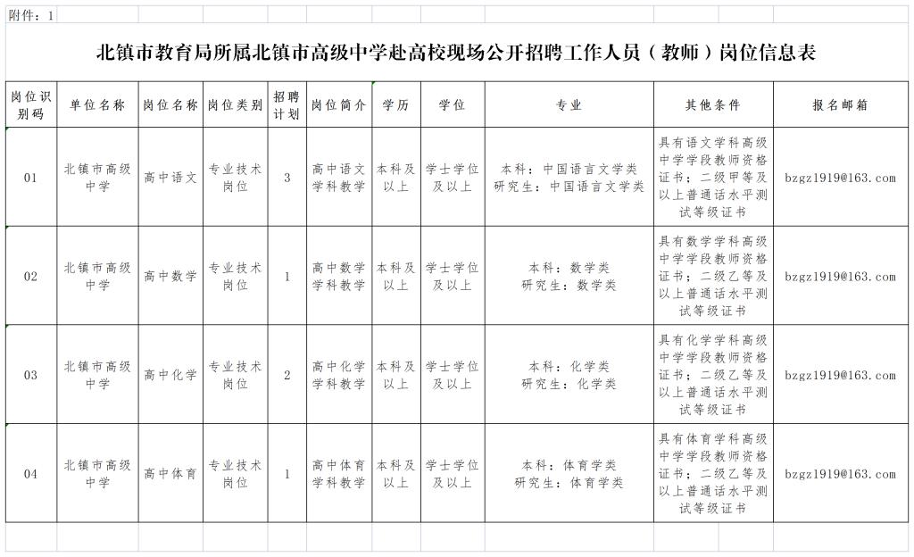 1.北镇市高级中学赴高校现场公开招聘工作人员(教师)岗位信息表