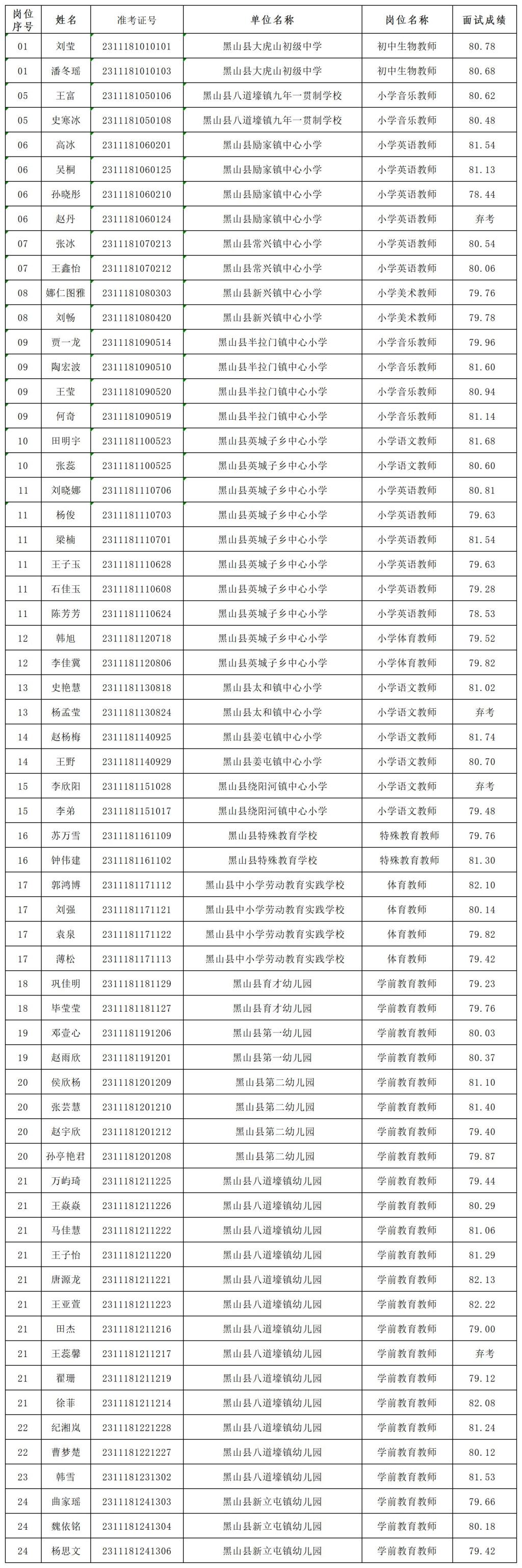 黑山县教育局所属学校2023年面向社会公开招聘事业单位工作人员(教师)面试成绩