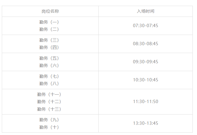 心理素质测试、资格复审及体能测评同时进行,按照岗位区分以下时间段开展,请入围人员严格按照报考岗位所对应的时间入场。