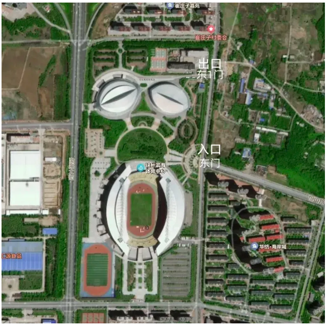 锦州滨海体育中心(太和区渤海大街六段6号):东门(恒山路与珠江街交叉口)为入口,东1门为出口(如图所示)。