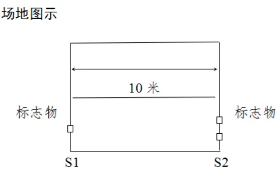 动作要求:受测试者采用站立式起跑,听到发令后从S1线外跑到S2线前(脚不得踩线)用手将竖立的木块推倒后折返,往返跑2次,每次推倒1个木块,第2次返回时冲出S1线。