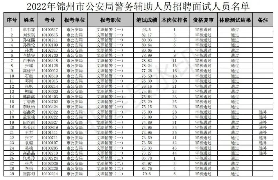 附:2022年锦州市公安局警务辅助人员招聘面试人员名单