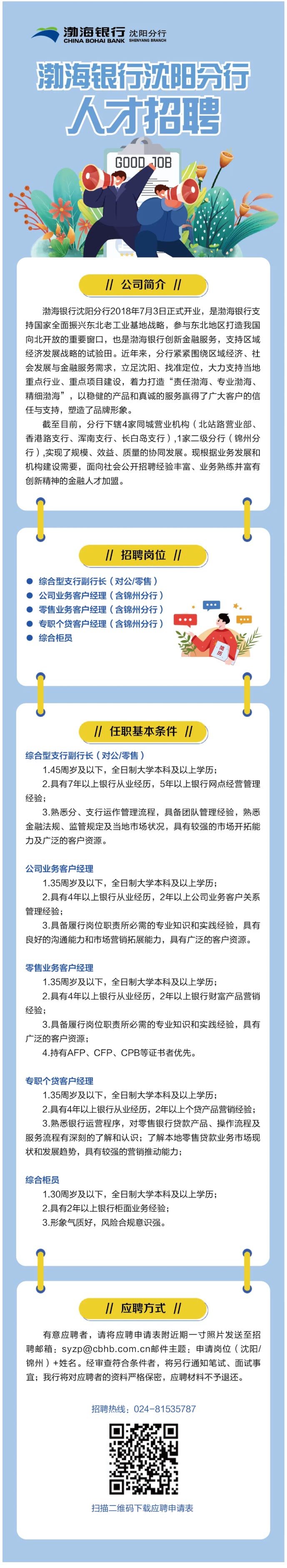 渤海银行沈阳分行人才招聘(锦州有岗)
