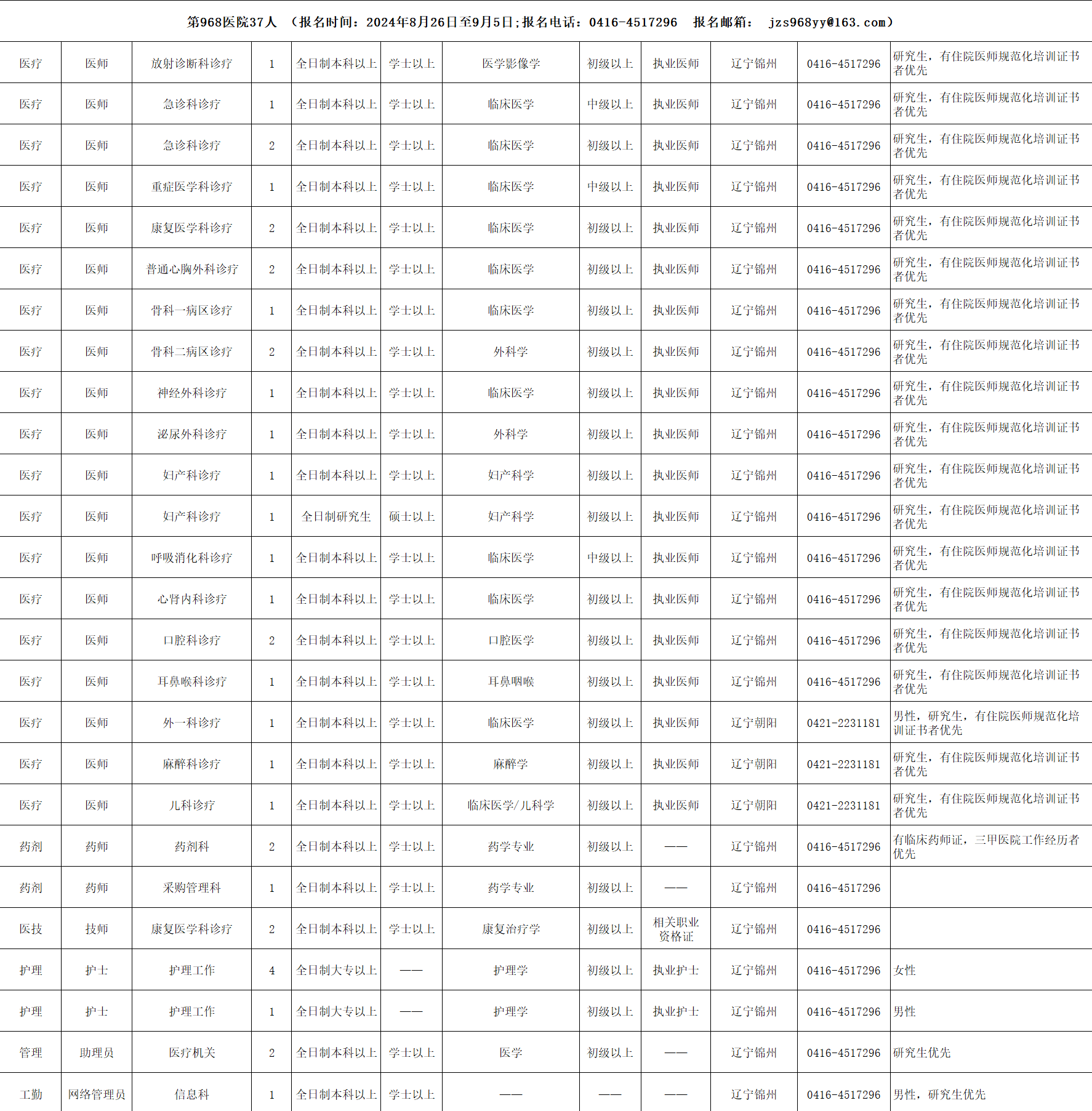 医院2024年第三季度招聘医疗、医技、护理、其他专业技术、工勤技能等岗位共37人,具体岗位如下: