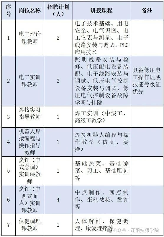 辽阳技师学院是辽阳市人力资源和社会保障局直属的公益二类事业单位,根据学院教学工作需要,现面向社会公开招聘电气、焊接、烹饪等专业外聘教师,具体事项公告如下: