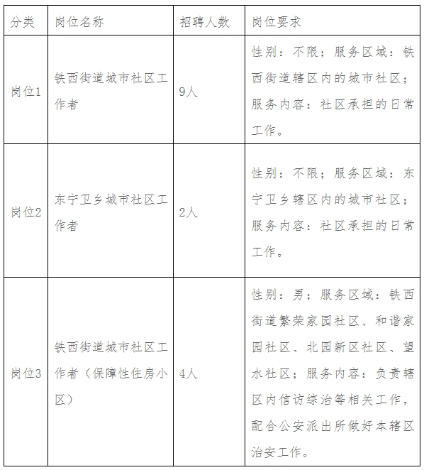 岗位职责:贯彻执行党的路线、方针、政策和国家法律、法规,依法组织居民开展自治活动,教育和引导居民遵纪守法,自觉履行依法应尽的义务;协助政府及有关部门做好与社区居民利益相关的基层社会治理、政府公共服务和社会事务服务;能够适应社区办公智能化要求,掌握相关技能。