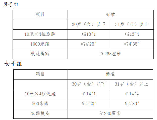 备注:年龄计算时间截至到参加体能测试当月。10米×4往返跑每人最多可测2次,男子1000米跑/女子800米跑每人最多可测1次,纵跳摸高最多可测3次。