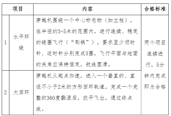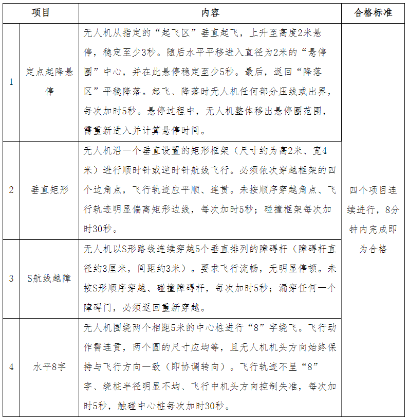 (2)专业科目测试标准:参考中国民用航空局2024年印发的《民用无人驾驶航空器操控员执照考试管理办法》,主要考察应聘人员是否熟练掌握无人机或穿越机起飞、悬停、水平环绕、八字环绕等基础操控技能。具体标准如下: