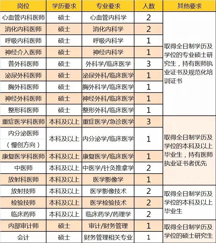 1. 所有岗位符合学历要求及以上者均可报名,应聘者年龄一般不超过35岁,有工作经验者优先。本科医师岗位已完成住院医师规范化培训并获得合格证者优先。