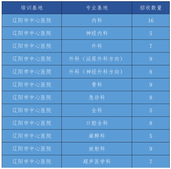 辽阳市中心医院是国家首批住院医师规范化培训基地,中国医科大学研究生培养基地和非直属临床教学医院、锦州医科大学校外研究生培养单位,拥有包括内科、神经内科、外科、外科(泌尿外科方向)、外科(神经外科方向)、骨科、急诊科、全科、口腔全科、麻醉科、放射科、超声医学科12个专业基地。