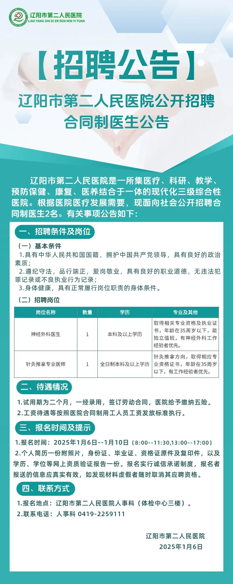 【招聘】辽阳市第二人民医院公开招聘合同制医生2人公告