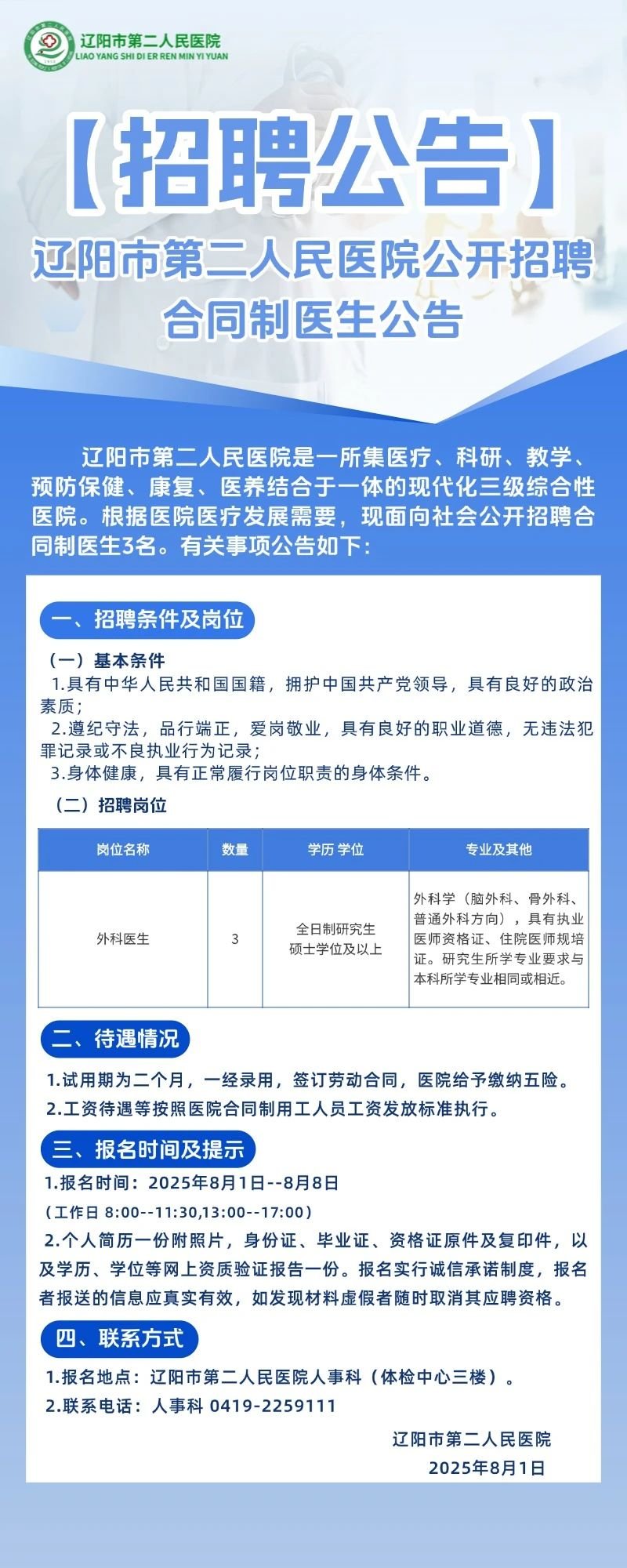 辽阳市第二人民医院公开招聘合同制医生3人公告