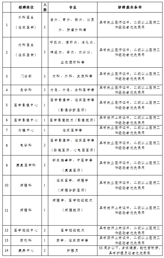 医院按三级综合医院设置要求,开设了急诊科、普外科、泌尿外科、内分泌科、神经内科、神经外科、消化内科、妇产科、骨科、肛肠科、呼吸和重症医学科(ICU)、康复科、肾内科、心内科、病理科、透析中心、医学影像中心、医学检验中心、体检中心等30多个学科。