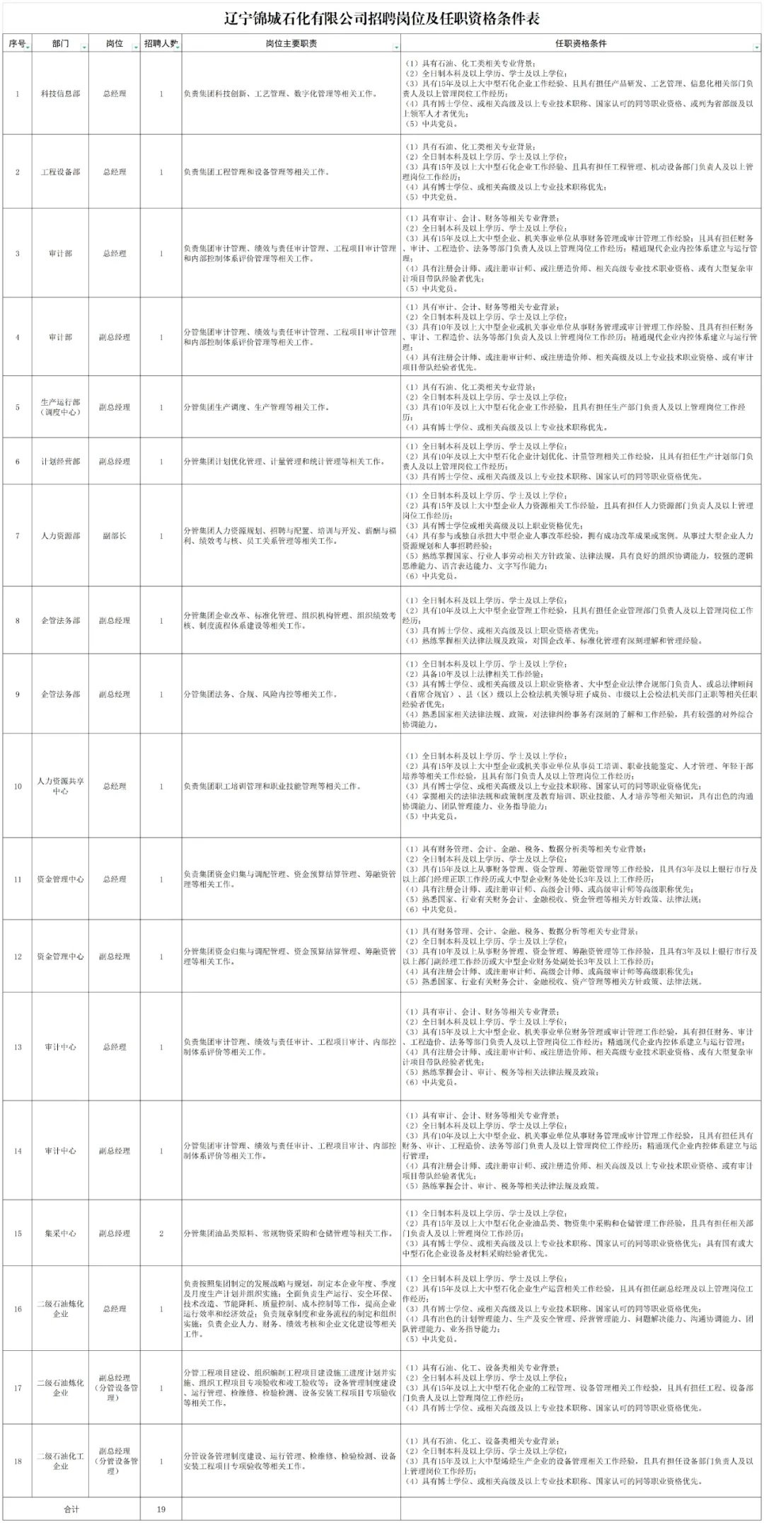 (2)科技信息部、工程设备部总经理及石油炼化企业总经理岗位,须具有大中型企业15年及以上相关工作经验,且具有担任管理岗位工作经历;资金管理中心总经理岗位,须具有大中型企业或银行15年及以上相关工作经验,且具有担任管理岗位工作经历;