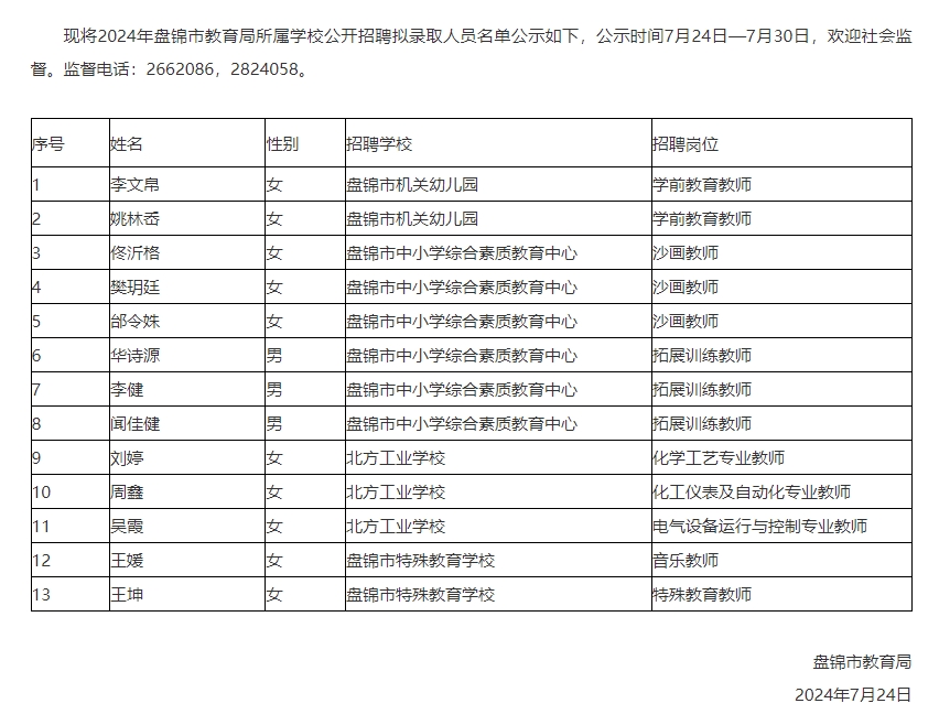 2024年盘锦市教育局所属学校校园招聘教师拟录取人员名单