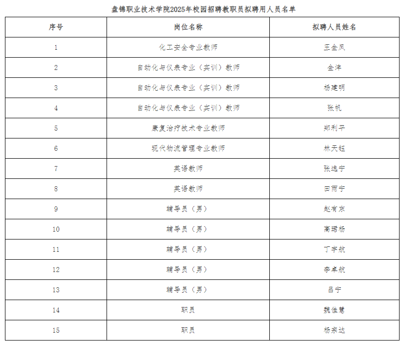 根据盘锦职业技术学院官网2025年4月9日发布的《盘锦职业技术学院2025年校园招聘教职员公告》要求,经过报名、资格审查、面试、体检和考察等程序,现将盘锦职业技术学院2025年校园招聘教职员拟聘用人员名单公示如下: