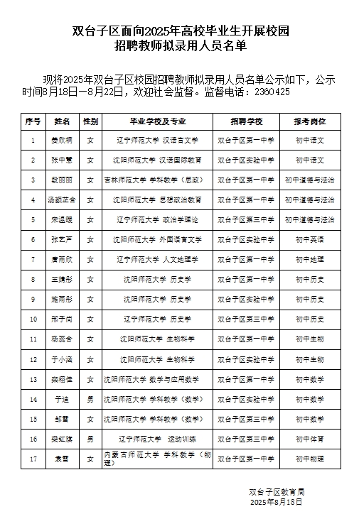 盘锦市双台子区面向2025年高校毕业生开展校园招聘教师拟录用人员名单