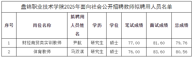 盘锦职业技术学院2025年面向社会公开招聘教师拟聘用人员公示