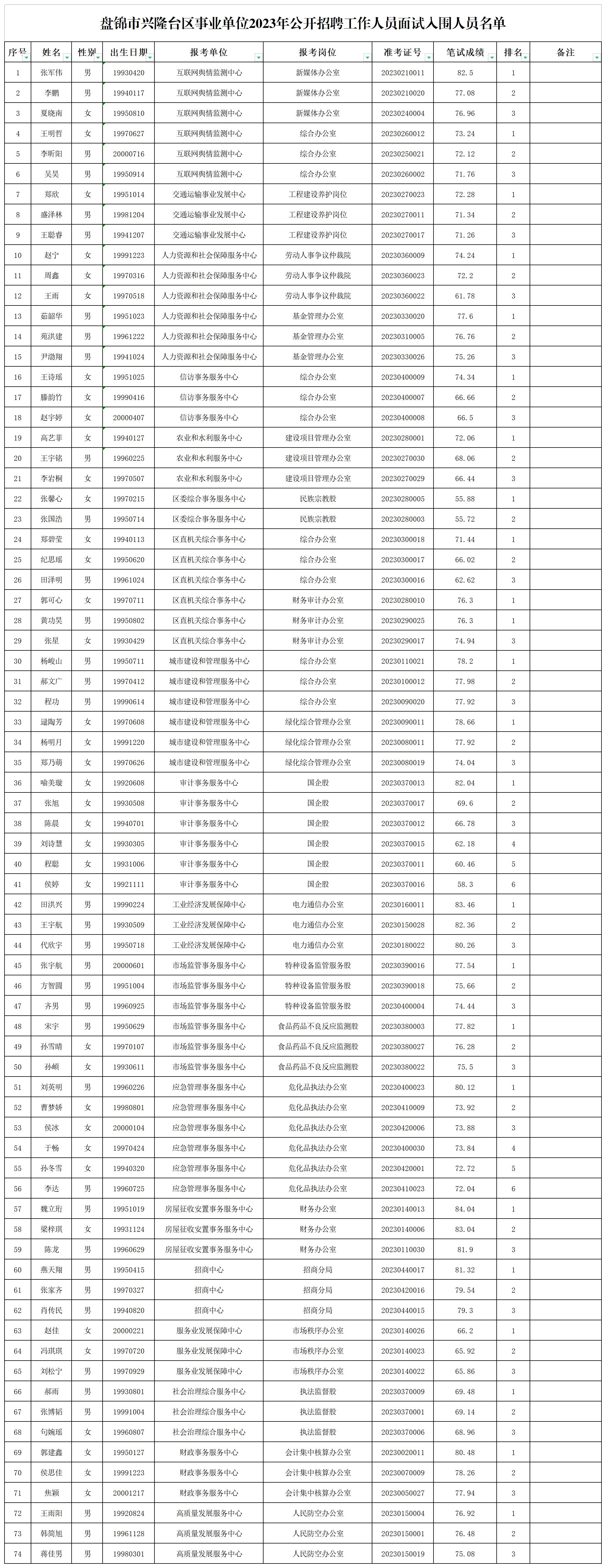 经研究,决定近日开展2023年兴隆台区公开招聘事业单位工作人员面试工作。根据《事业单位人员管理条例》(国务院令第652号)《盘锦市事业单位公开招聘人员暂行办法》(盘人社发〔2013〕17号)《盘锦市兴隆台区事业单位2023年公开招聘工作人员公告》等有关要求,现就面试有关事项通知如下: