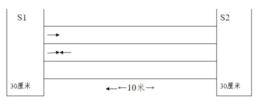 测试方法:考生用站立式起跑,听到发令后从S1线外起跑,当跑到S2线前面,将30厘米区域中立着的水瓶推倒随即往回跑,当跑到S1线前面,同样将30厘米区域中立着的水瓶推倒随即往回跑,记录跑完全程的时间。记录以秒为单位,取一位小数,第二位小数非“0”则进“1”。每个考生最多测试2次。