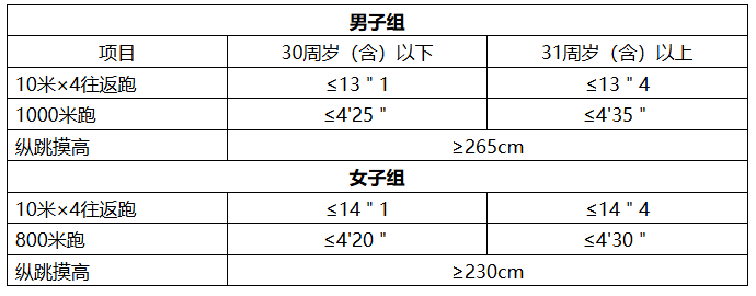 备注:凡测试项目中任意一项不达标的,即为体能测评不合格。