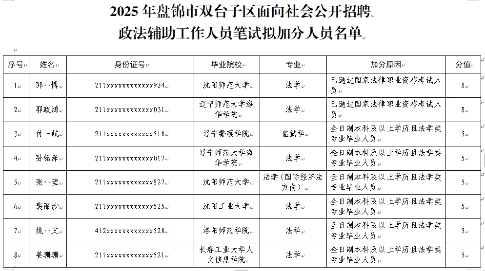 7月25日,2025年盘锦市双台子区面向社会公开招聘政法辅助工作人员的报名与缴费工作已结束。经审核,现将符合笔试加分的人员进行公示。公示时间:2025年7月29日至8月4日。公示期间,广大群众对拟加分人员有异议的,可通过电话反映。反映情况要实事求是、客观公正,有事实依据和证据材料。提倡实名举报,留下联系方式,以便调查核实。