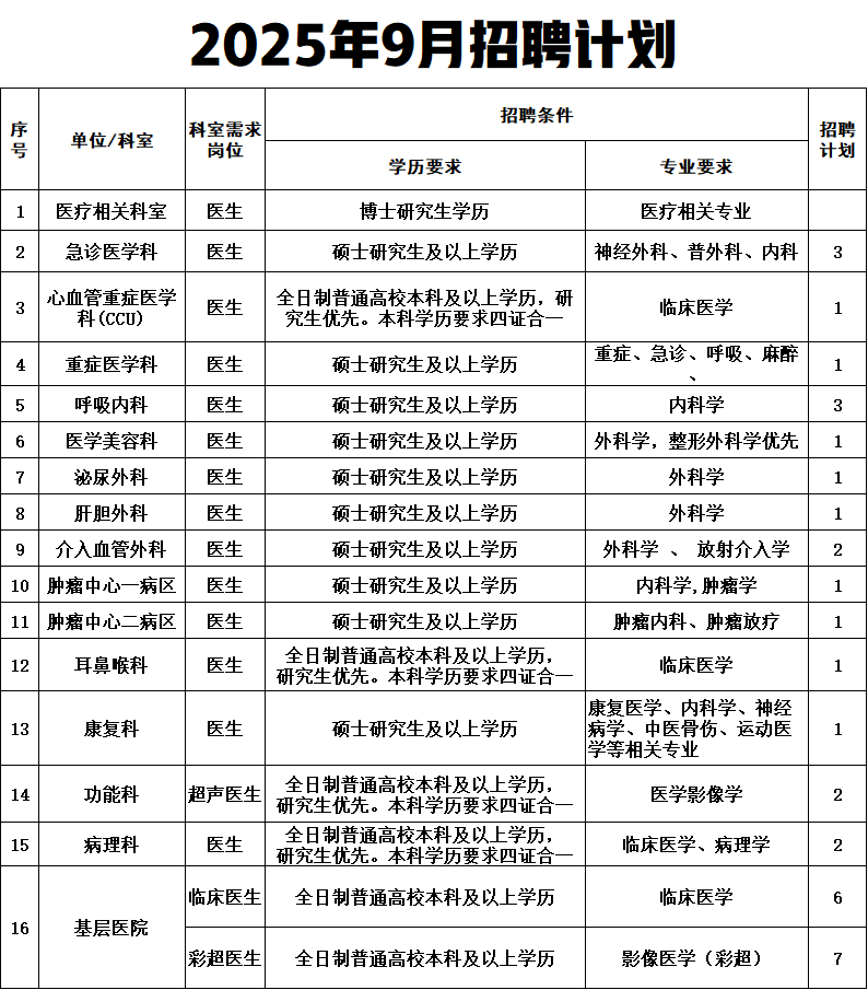 ①年龄在30周岁以下(1995年1月1日以后出生)。具有主治医师资格且特别优秀的,年龄可放宽至35周岁(1990年1月1日以后出生)。