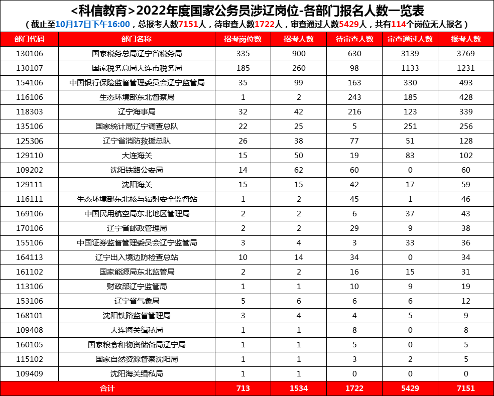 10月17日是国考报名第三天,据科信教育统计,截至16时,辽宁地区岗位报名人数已经突破七千,5429人通过审核,较昨日16时增加了2494人,与去年同期数据相比有大幅增加,共有114个职位目前无人报考,约占总职位数的16%。